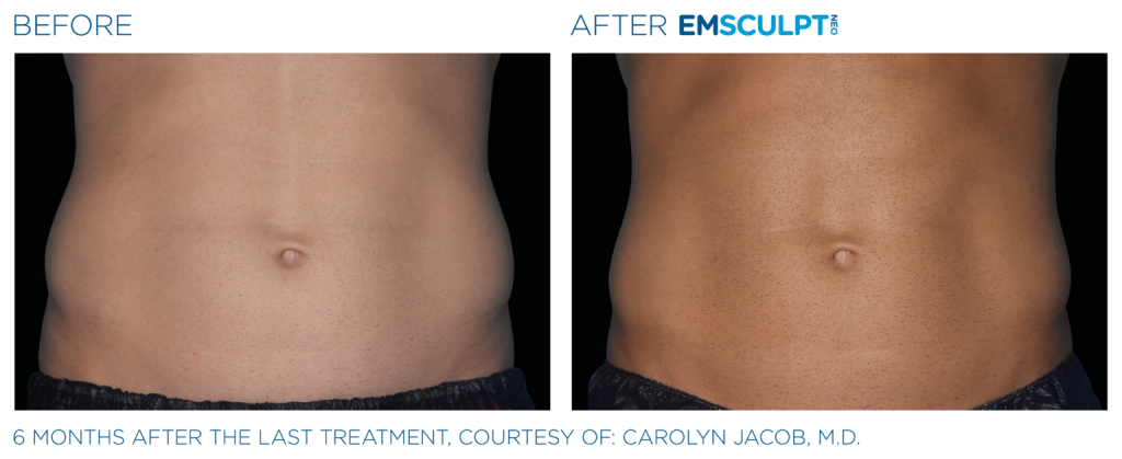 The number of treatments required is dependent on your desired results and where you are starting in terms of muscle tone and undesirable fat. One series of EMSCULPT NEO treatment will increase muscle up to 25% and reduce fat by up to 30% in the treated area. Many people are pleased with the results of just one series of EMSCULPT NEO treatment. Some people feel that they need more than one series of treatment to achieve their desired results.